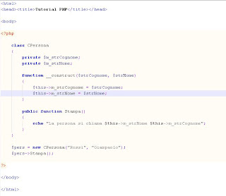 Dalla versione 5 il linguaggio PHP ha riscritto tutto il codice per la gestione delle classi ed ora si può parlare di un vero e proprio linguaggio di programmazione orientato agli oggetti. Vediamo con un semplice esempio una classe CPersona che presenta soltanto due proprietà, il nome ed il cognome, un costruttore ed un metodo per stampare i dati.
