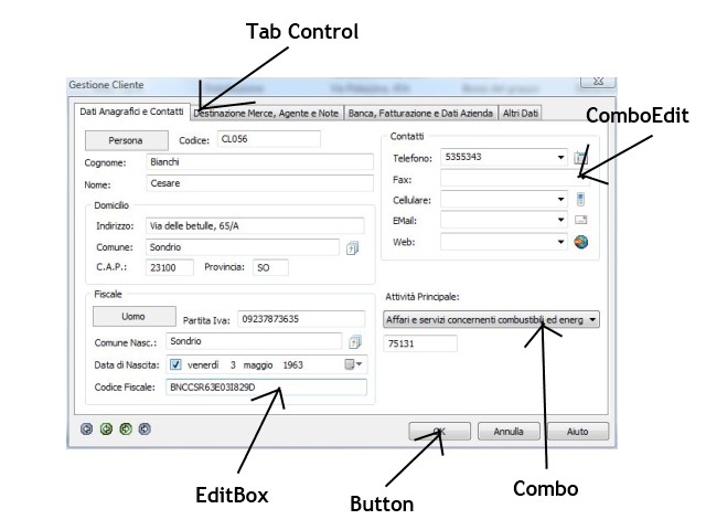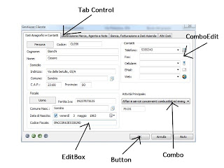 - ComboBox o Casella Combinata – Un controllo composto da un EditBox con a lato un pulsante con una freccia, che se premuto fa apparire una ListBox con una lista di valori. Questo controllo può essere di due tipi, il primo con l’inserimento nella EditBox di valori che non sono presenti nella ListBox oppure la possibilità di scegliere solo i valori nella ListBox.